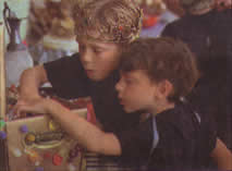Scepter Satay (chicken wands topped with paper crowns a la rack of lamb) changes to Sweet and Sour Scepters when it's discovered that peanut and plum sauces aren't to the kids' tastes. And the crowns don't seem to affix easily. For the Bishop's Hats, adults do well with puff pastry, but for the kids we decide to go with pizza dough.