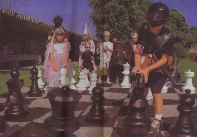 As the kids begin arriving in costume - child knights and damsels, pint-sized pawns and rooks - we're ready. There are tables set up for chess and, even better, a larger-than-life lawn chess game whose pieces reach above most of the kids' knees.